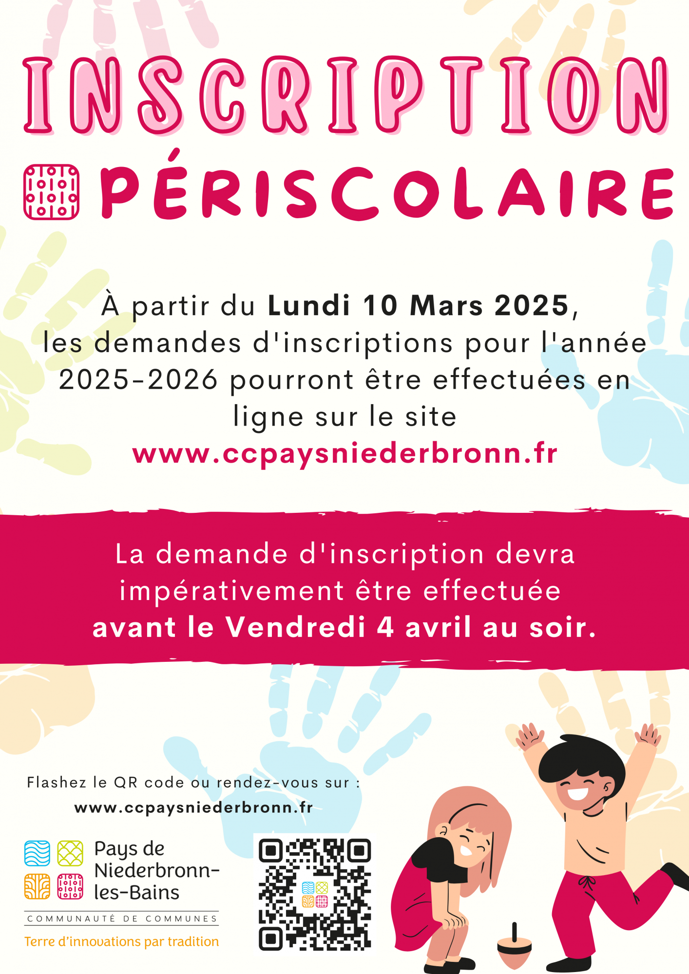 Les inscriptions pour l'année 2026-2027 ont lieu du 2 au 13 mars 2026 et s'effectuent uniquement en ligne, sur le site web de la Communauté de communes du Pays de Niederbronn-les-Bains : www.ccpaysniederbronn.fr (Accueil - Vivre - Enfance & jeunesse - Inscriptions périscolaires).